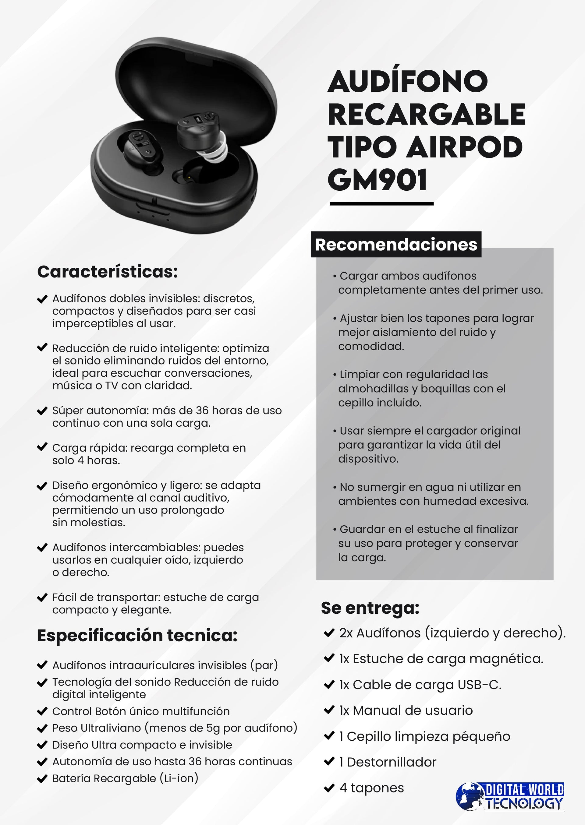 El GM901 viene con un estuche cargador tipo power bank, lo que permite no solo proteger los audífonos, sino también mantenerlos siempre cargados. Su batería de larga duración te brinda varias horas de uso continuo, y puedes recargarlos fácilmente mediante el cable USB incluido, sin preocuparte por cambiar pilas.