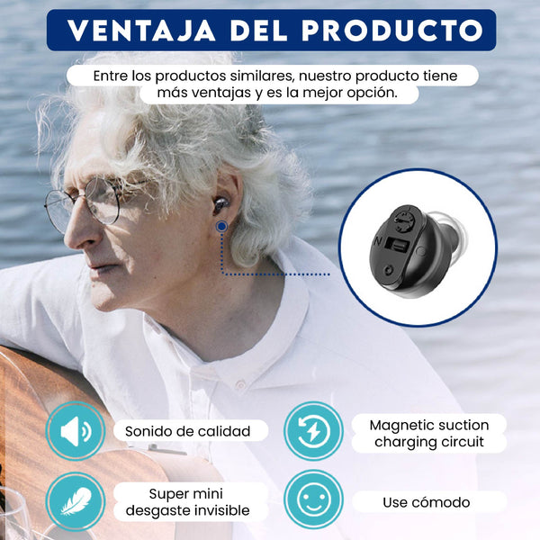 Es un audífono recargable, ideal para personas con pérdida auditiva leve a moderada que buscan una solución moderna, discreta y funcional. Especializado en sonidos importantes como voces y alertas del entorno, ofreciendo una experiencia auditiva cómoda, elegante y sin estigmas.