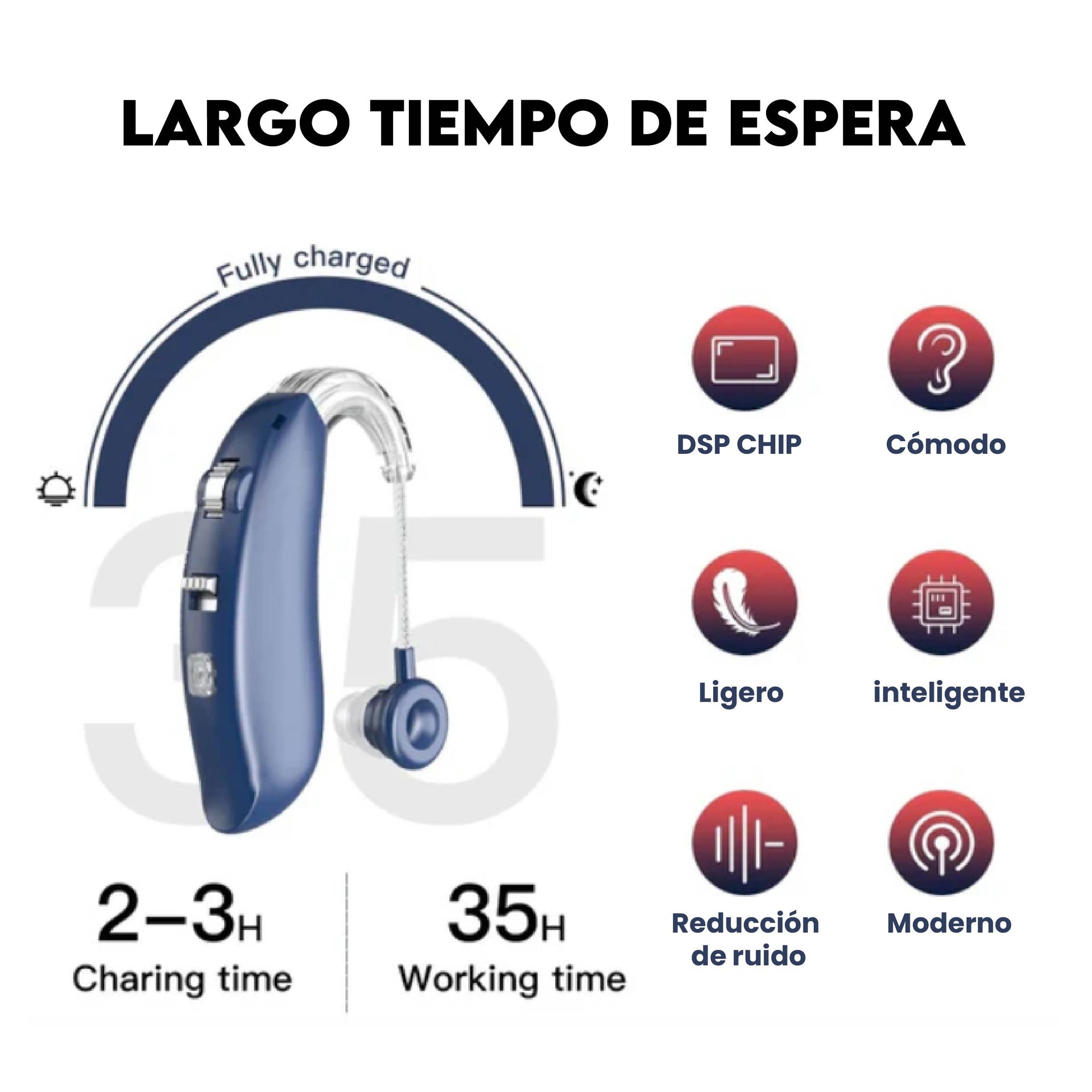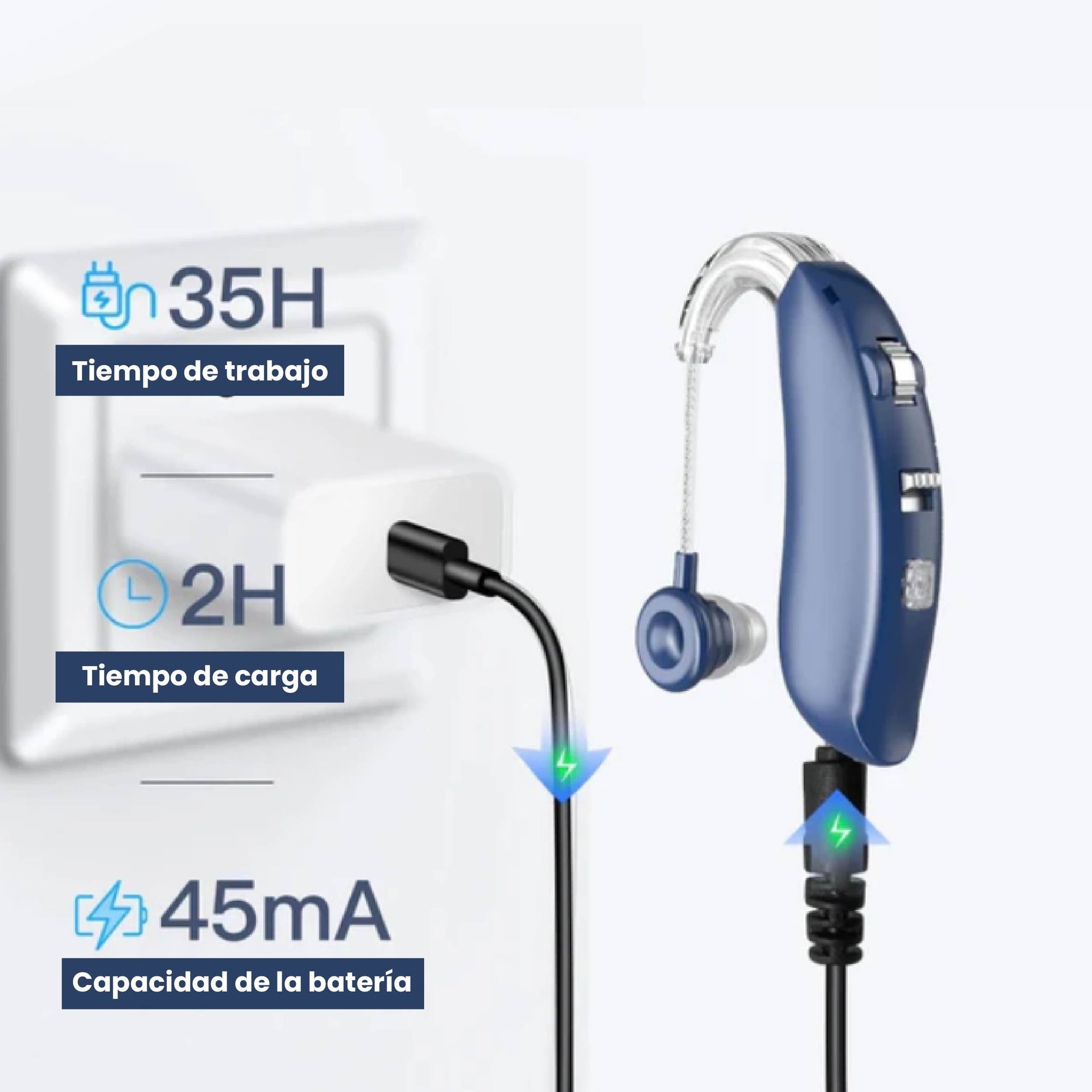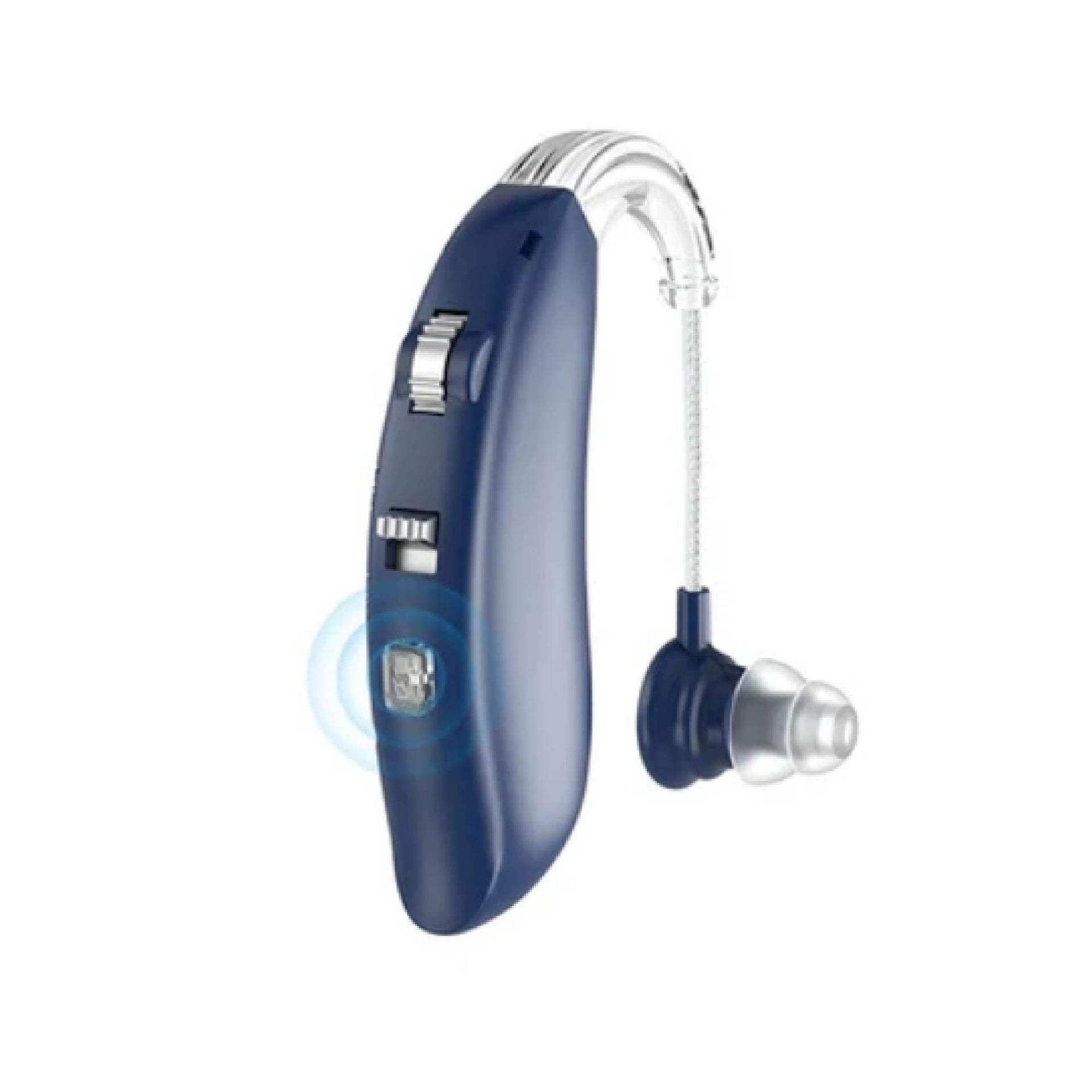 Cuenta con una batería recargable de larga duración y un diseño ergonómico que se ajusta cómodamente detrás de la oreja. Su formato ligero y moderno lo hace ideal tanto para adultos mayores como para usuarios jóvenes que buscan una solución auditiva funcional y estilizada.